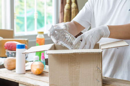 Volunteer hands collecting food into donation box. Cardbox full of grocery products. Donation, charity, food bank, help for poor families, migrants, refugees
