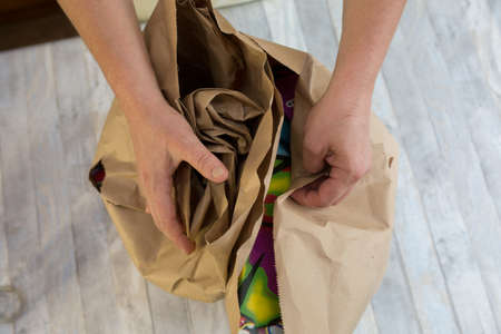 Female hands are wrapping paper bags from delivered food. Waste paper is placed in separate paper waste bins for recycling.