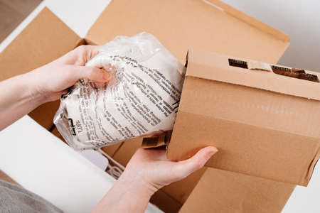 Woman opening parcel online order. Unpacking box with ordered items. Online shopper opening delivered parcel. Delivery service concept