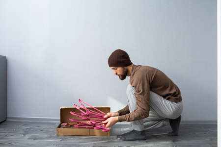 bearded man unpacks a box of furniture parts