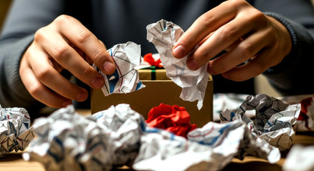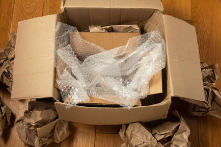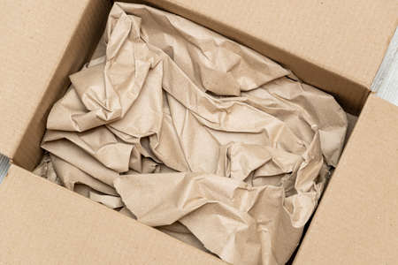 A woman taking crumpled paper out of an open cardboard box. Close up.