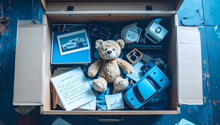 A collection of vintage mementos like postcards and old tickets, scattered across a desk, with an empty space to add a cherished photograph