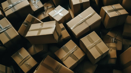 This image showcases an aerial view of numerous cardboard boxes secured with tape, creating an organized arrangement in a dark storage environment.