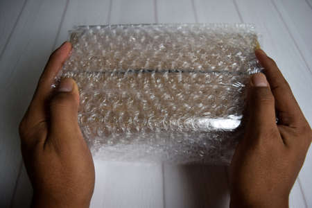 Plastic black bag covering the parcel out for protection product cracked or insurance during transit in brown carton box. Ecommerce shipment service concept