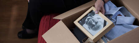 Female hands stack Retro objects in a cardboard box on a wooden floor. Antiques, vintage. Top view