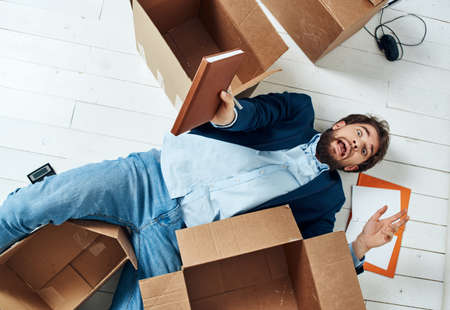 hands open the hears, plastic packaging and cardboard box on the floor of the house