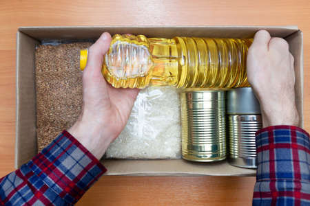 Man in a shirt stacks food in case of emergency, natural disasters, self-isolation, pandemics, covid 19. Food with a long shelf life. Canned food, oil, rice, buckwheat. Help for the starving