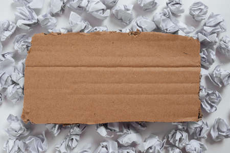 Paper Wraps Placed Under Cardboard With Important Information. Wrinkled Notes Arranged Underneath Paperboard With Crutial Idea. Crumpled Memos With Critical Data Above.