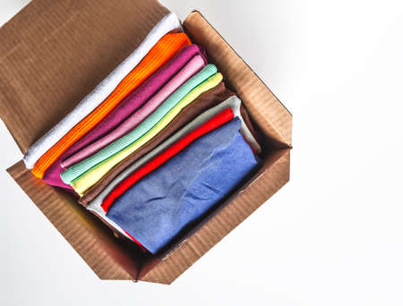Folded colorful clothes in the box. Home organizing. Domestic vertical storage.