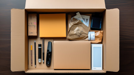 A neatly arranged delivery box holds tech gadgets, a portable device, wrapped accessories, and small components illuminated by blue light.