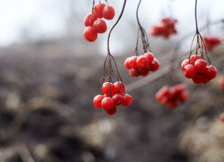 Clusters of red viburnum berries on the tips of branches