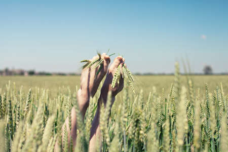 Wheat field. A boy hand and a wheat field. Reconnecting with nature. Back to nature