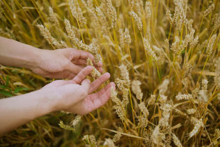 A man agronomist touches with her hand golden spikelets of ripe wheat close-up.