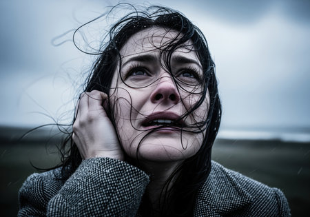 A dramatic, cinematic close up of a distressed woman outdoors during a storm. her face is wet, hair is windswept, and she looks up with an expression of despair.