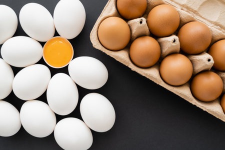 Top view of brown and white chicken eggs near cardboard tray on black background