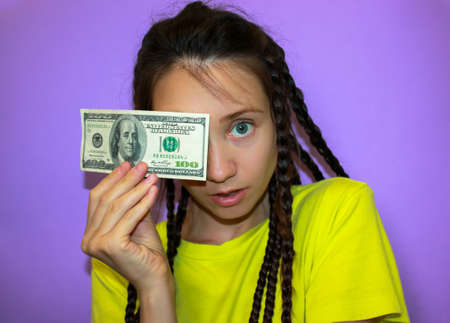 Surprised brunette blue-eyed girl in a yellow T-shirt on a purple background holding a hundred dollar note in hand, covering face. Success, business investment, finance, earning money, cash concept.