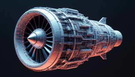 3d rendering of a jet engine on a dark background with blue light