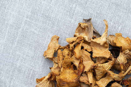 dried chanterelles on a texture background, copy space
