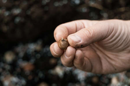 hand sadi in soil-soil flower bulbs. Hand holding a crocus bulb before planting in the ground