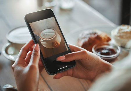 She wants to remember this moment. a woman taking photos of her cappuccino using her smartphone.