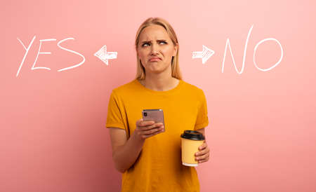 Blonde girl thinks about the right option. Yes or no. Confused and pensive expression. Pink background