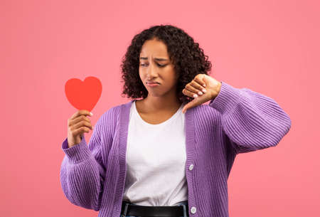Love sucks concept. Sad young black woman holding red paper heart and showing thumb down gesture over pink background