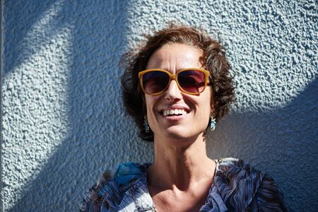 Smiling fair haired middle aged woman wearing blue t-shirt at sunset near the sea. Head shot
