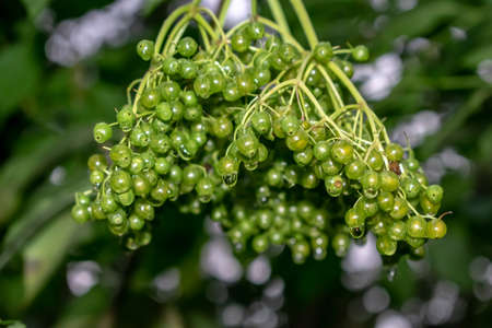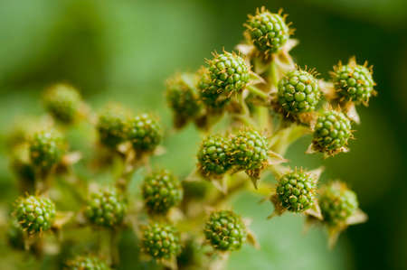 Natural food - green blackberries in a garden. Bunch of unripe blackberry fruit - Rubus fruticosus - on branch with green leaves on a farm. Close-up, blurred background.