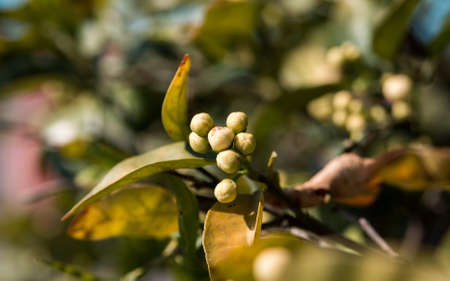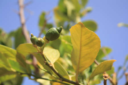 A lemon tree branch with green little fruit under sunlight. First lemons. Greece, Crete.