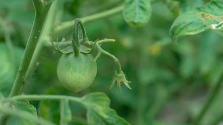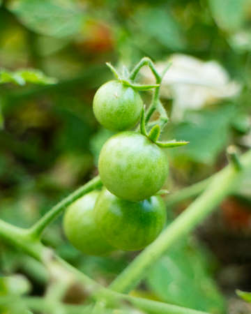 Green tomatoes growing in the garden. Close-up of unripe tomatoes.
