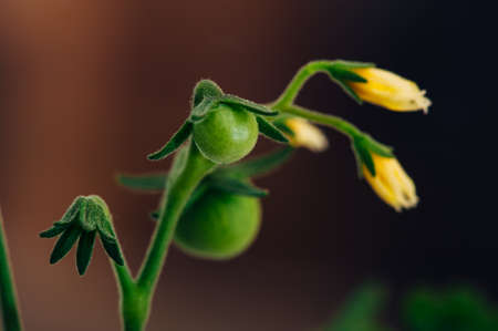 Spring seedlings. Small green tomatoes and yellow flowers close-up