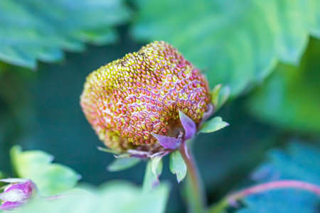Large green berries strawberries ripening in garden sunny day