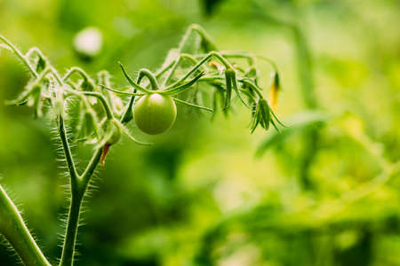 Close-up of green tomatoes on a branch of young seedlings in a greenhouse or greenhouse, the concept of agriculture, your own garden and growing plants