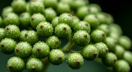 A detailed macro shot captures the lush green elderberries, each adorned with tiny, sparkling water droplets, showcasing the beauty of nature's freshness.