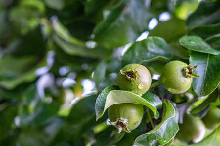 A young green pears on a tree after a rain in droplets of dew.