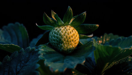 A detailed close-up of an unripe, pale green strawberry covered in glistening water droplets. The fruit is nestled among dark green leaves of its plant against a blurred, dark background. Soft light illuminates the textured surface of the berry and the moisture on the foliage, suggesting a fresh, early morning scene in a garden or farm environment.