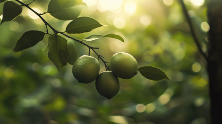 Three fresh limes on a branch, close-up shot with blurred green foliage in the background