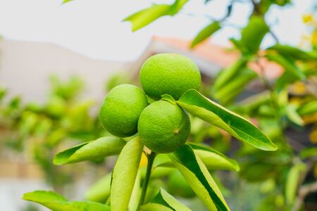 Close up of Green lime lemon tree and fruit with light in the morning at garden farm. Natural food concept.