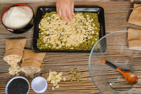 Oat flakes with pumpkin seeds on a wooden board on a rustic table