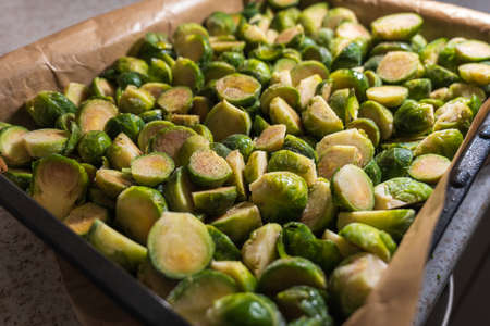 frozen sliced brussels sprouts on baking tray closeup
