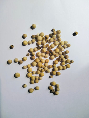 Dried white peppercorns isolated on white board with close up detail showing natural spice texture and culinary seasoning concept