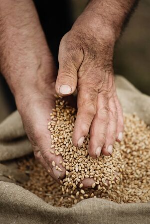 Close-up of male hands holding a grain of wheat on a background of the bag