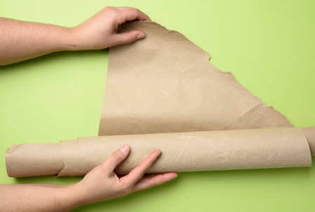 two female hands hold rolled brown paper, green background, top view