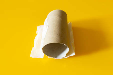 A finished toilet paper roll on a yellow background