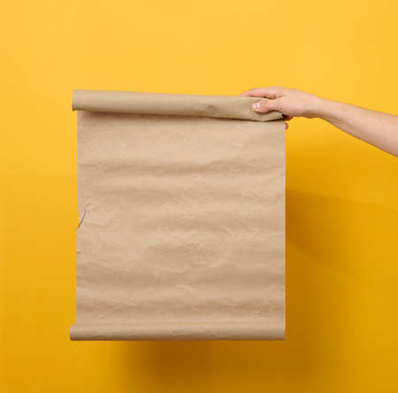 female hands holding a rolled roll of brown crumpled paper isolated on white background, copy space