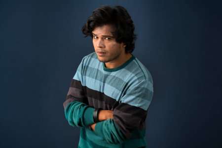 Portrait of Happy Indian young man with arms crossed against a dark background