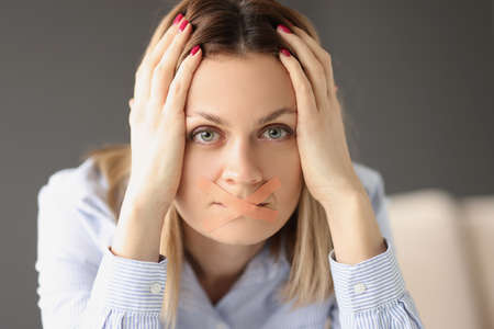 Woman sitting at table with her mouth sealed with plaster and holding her head
