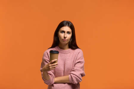 Need to cheer up. Tired sleepy beautiful woman in pink sweater with a tortured look has sad expression, carries disposable cup of drink containing caffeine. isolated on orange background