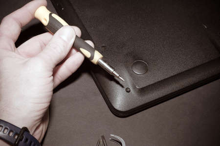 screwdriver unscrews the screw on the laptop. cleaning and repairing computers