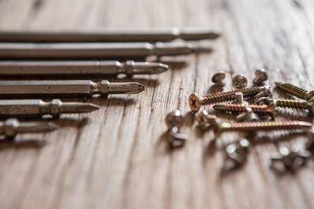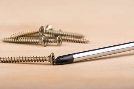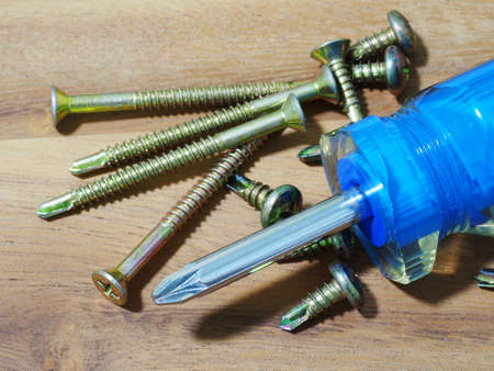 Metal screws and screwdriver on a wooden background. Close up. Copy space.
